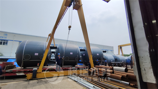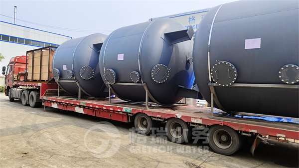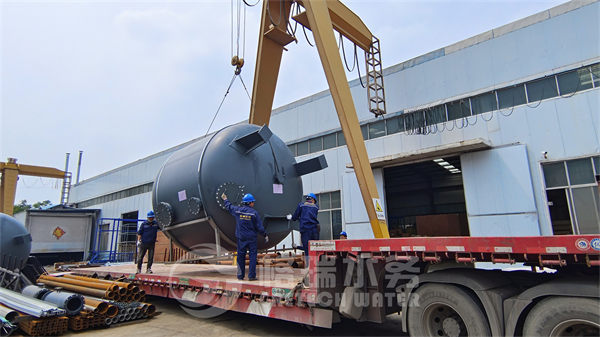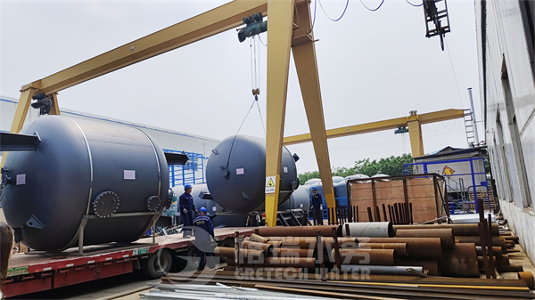今天發的是20臺大型多介質過濾器加配件,它們單只高4.8直徑3.4,用17米的大車進行裝運,每輛車裝3臺,師傅們安全熟練的操作著兩個行車進行調運裝車。這次發貨持續了近兩天時間,陸續7輛大車進來裝車,裝車后車隊緩緩的駛出廠區,前往連云港港口,再通過海運發往印尼項目現場。