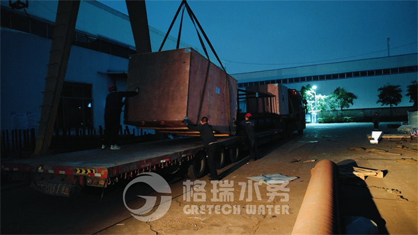 今天發貨的設備包括多介質過濾器、刮泥機、板框壓濾機、加藥裝置、風機、電控柜等安裝配件。因通過海運運輸,設備用木箱進行打包,現場看到工程人員安全有序的操作著行車裝車,裝卸組人員配合著裝車,裝車后大車緩緩的駛出廠區發往青島港口。